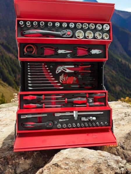 Este kit de caja de herramientas voladiza de acero ofrece una amplia colección de 8o piezas de herramientas manuales esenciales, todas elegantemente alojadas en una llamativa caja de metal rojo. Hecho a mano de acero duradero, este conjunto encarna calidad y fiabilidad, lo que garantiza longevidad y resistencia para tus proyectos.