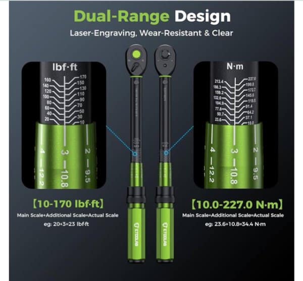 【Fácil de usar】La escala de esta llave dinamométrica de 1/2 unidad está grabada con láser, utilizando un fondo negro con marcas blancas. Esto garantiza una legibilidad clara y fácil de la báscula, incluso a la luz del sol. Con un diseño de doble escala, los usuarios pueden leer convenientemente los valores de par en dos unidades diferentes de acuerdo con sus preferencias, sin necesidad de conversión